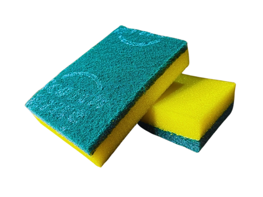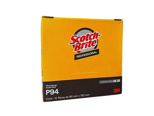 La Fibra Esponja Profesional Scotch-Brite™ P94 es de uso dual, posee un lado con fibra abrasiva verde para una limpieza más profunda y otro lado con esponja amarilla para superficies delicadas.